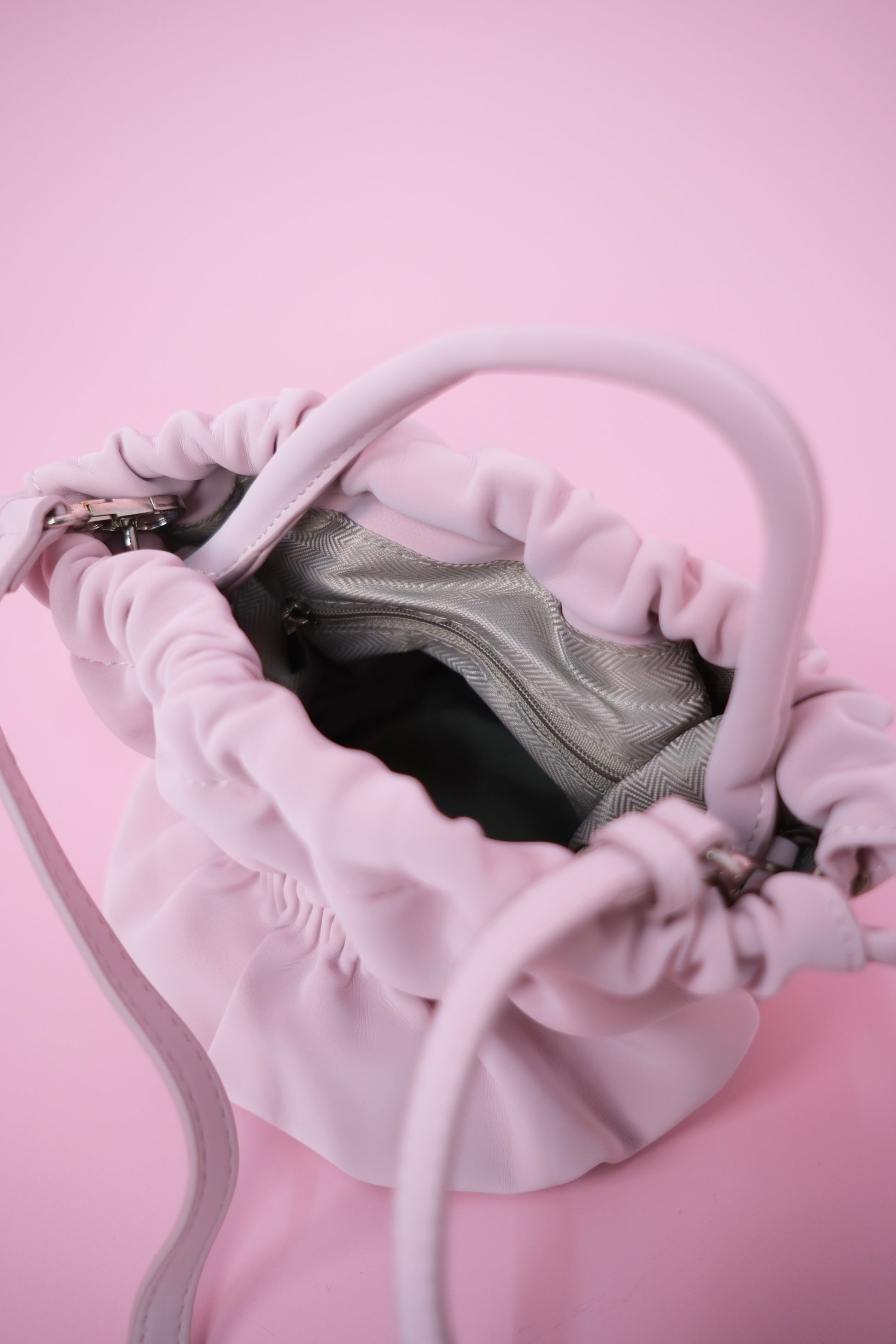 A cute companion from day to night, with a detachable shoulder strap to boot! Features a scrunchy top opening and inner zip pocket.